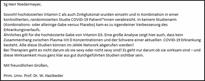 (Anmerkung: Das Wort „sexy“ kommt in diesem Antwortschreiben deswegen vor, weil in einem nicht mehr im Netz befindlichen Video vermutet wurde, die Anwendung von Vitamin C würde von der Ärzteschaft für nicht genug sexy gehalten …) |